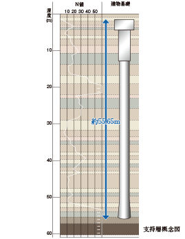 基礎構造は支持地盤がある地中約55.65mまで9本の拡底杭をアースドリル工法で打ち込みました。地盤や建物に応じて適切な杭を打ち込むことで高い支持力を実現、しっかりと建物を支えています。
