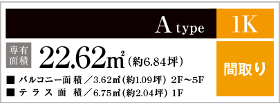 専有面積:22.62㎡(約6.84坪)バルコニー面積/3.62㎡(約1.09坪)2F~5F テラス面積/6.75㎡(約2.04坪)1F