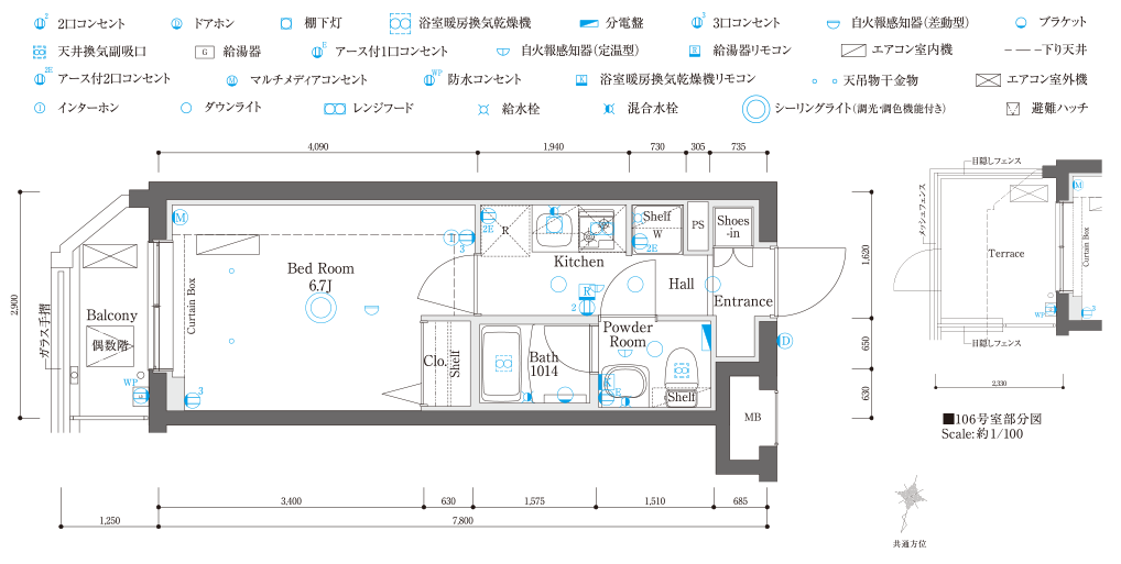 専有面積:22.62㎡(約6.84坪)バルコニー面積/3.24㎡(約0.98坪)2F~5F テラス面積/6.48㎡(約1.96坪)1F