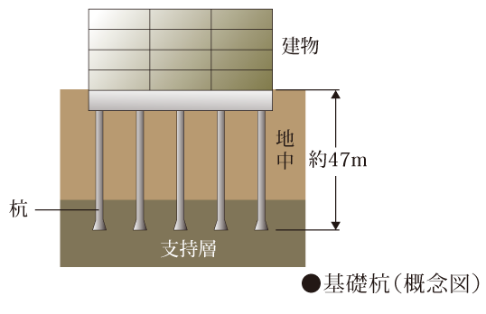 基礎杭はNEW-EAGLE耐震工法(一部NEW-EAGLE引抜き杭工法)による場所打ちコンクリート杭を採用。支持力の高い基礎杭を約47mの支持層まで7本打ち込み建物と住まう方の暮らしを支えます。