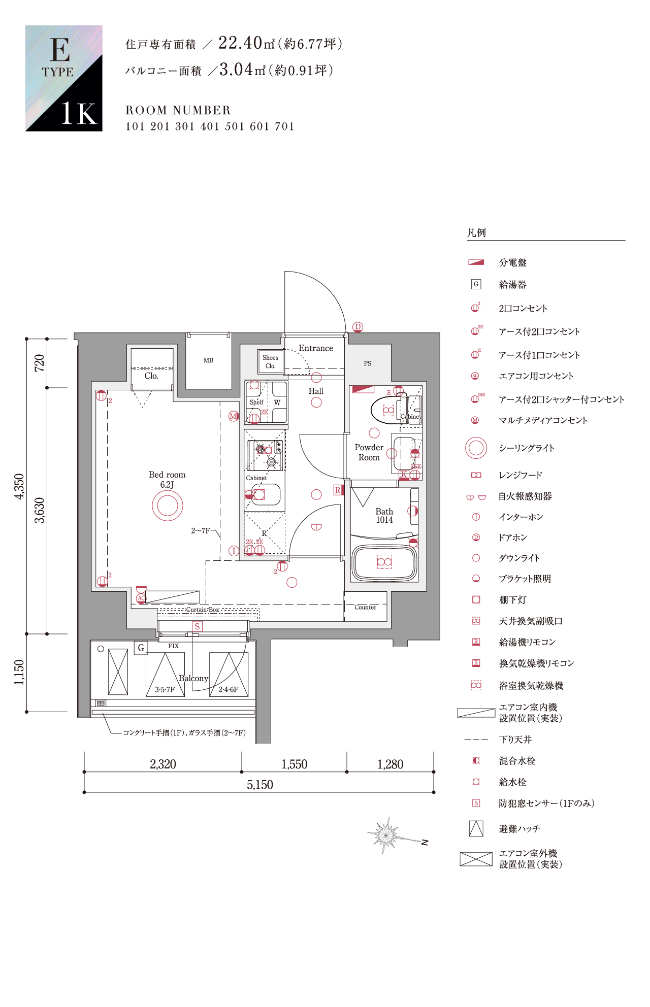 専有面積:22.40㎡(約6.77坪)バルコニー面積/3.04㎡(約0.91坪)